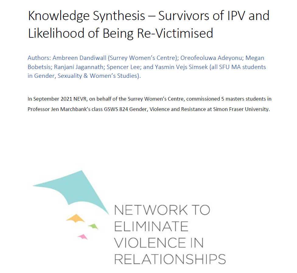 This report presents a comprehensive synthesis of current research on the factors that increase the likelihood of re-victimization among survivors of intimate partner violence. Developed by NEVR in partnership with the Surrey Women’s Centre and researchers from Simon Fraser University, the synthesis draws from over 80 academic and community sources to identify patterns of vulnerability, including prior abuse, poverty, disability, immigration experiences, and childhood trauma.